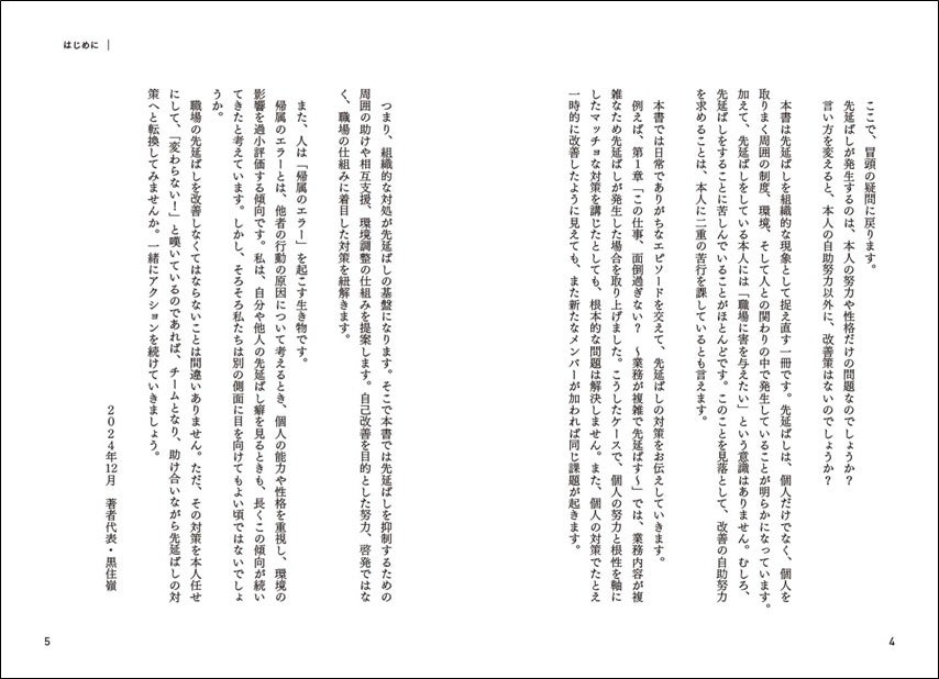 本書は、自身も種々の「先延ばし」で苦しんだことでこの問題研究に取り組む著者を迎え、組織で発生する仕事の先延ばし現象について、科学的知見を踏まえた組織的な仕組みやアクションで解決を考えます。
