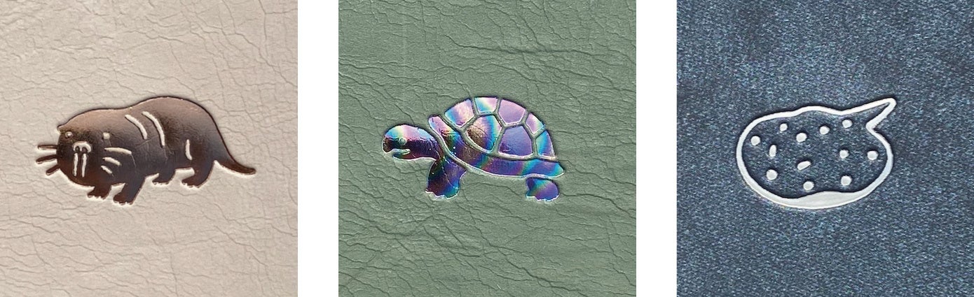 魚朱印のスタンプはスタッフの手作り。生きものの特徴を再現しリアルを追い求めてデザインいたしました。