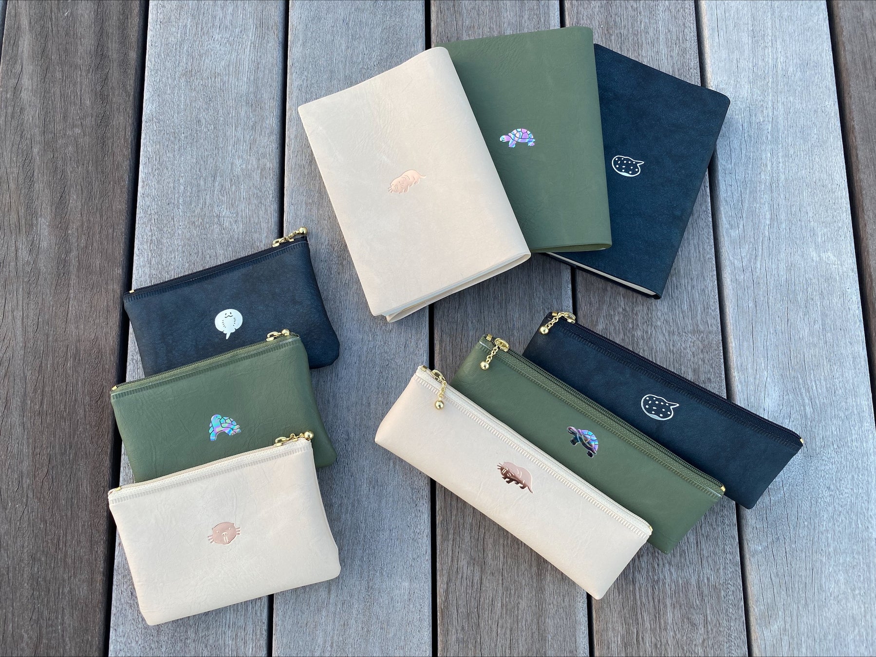 アトアで大人気のポルカドットスティングレイ、アルダブラゾウガメ、ハダカデバネズミをワンポイントで箔押ししたペンケース、ミニポーチ、ブックカバーができました。ペンケースとポーチは表裏でデザインが異なり、それぞれ生地感も違うのでぜひお気に入りを見つけてください♪普段使いにもギフトにもおすすめです。