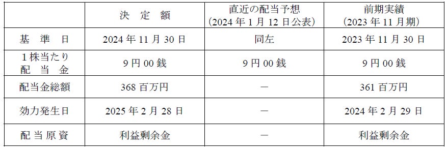 アステナホールディングス株式会社(本社:東京都中央区、代表取締役社長:瀬戸口 智、証券コード:8095)は、2025年1月14日開催の取締役会において、下記のとおり、2024年11月30日を基準日とする剰余金の配当を行うことについて決議し、2025年2月27日開催予定の第85回定時株主総会に附議することとしましたので、お知らせいたします。