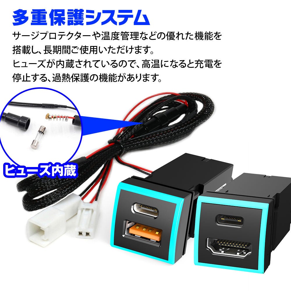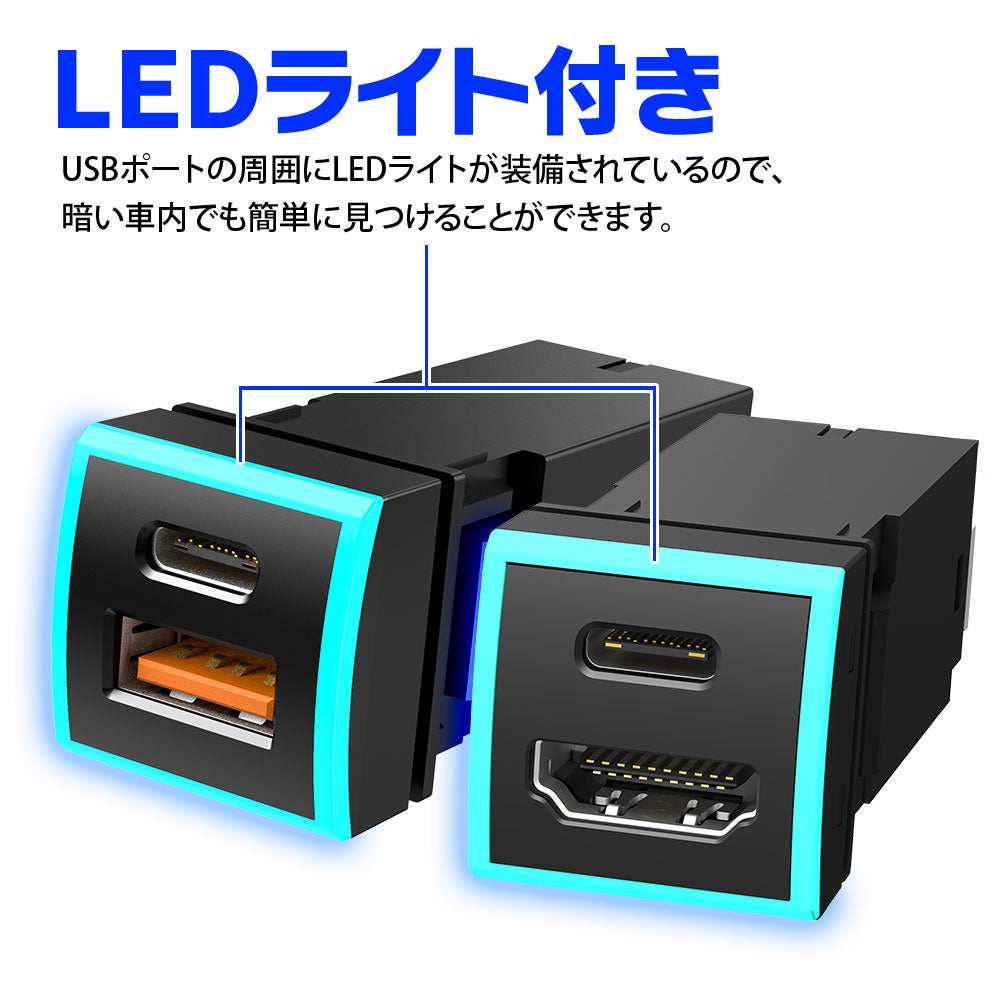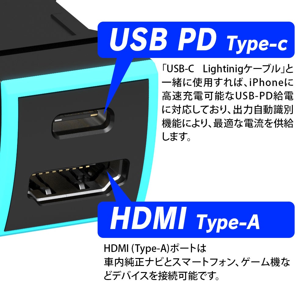 Type-C PDポートを搭載し、フルスピード充電が可能です。HDMI (Type-A)ポートは、車内純正ナビとスマートフォン、ゲーム機などデバイスを接続可能。