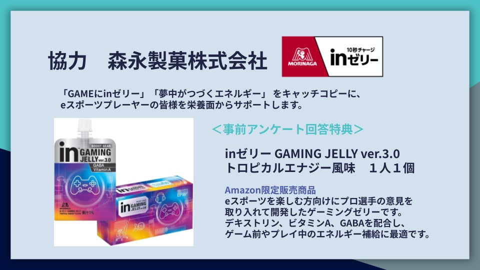市内高校eスポーツ部員向けに事前に実施したアンケートの回答特典として、「inゼリー GAMING JELLY ver.3.0」を森永製菓株式会社に提供いただきました。