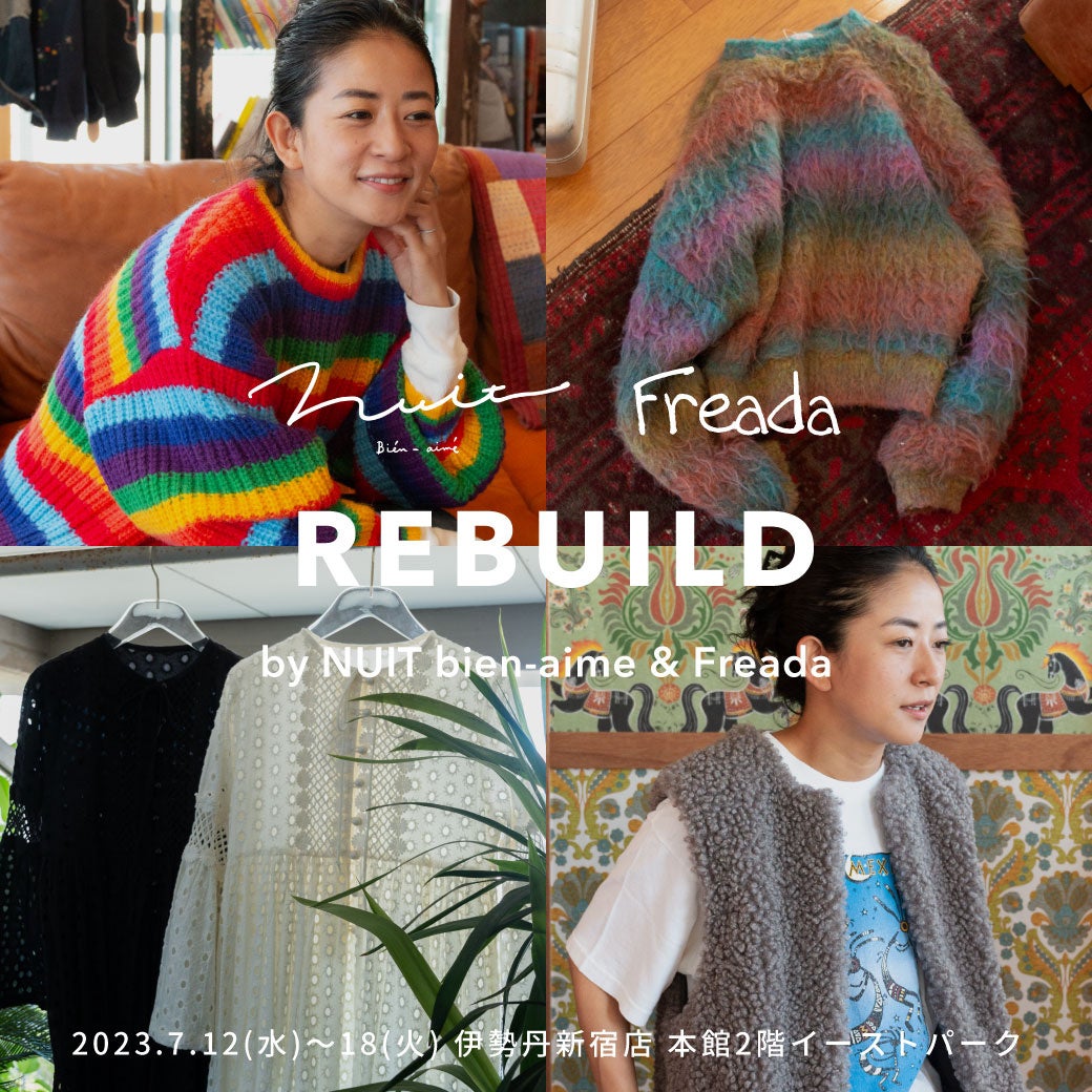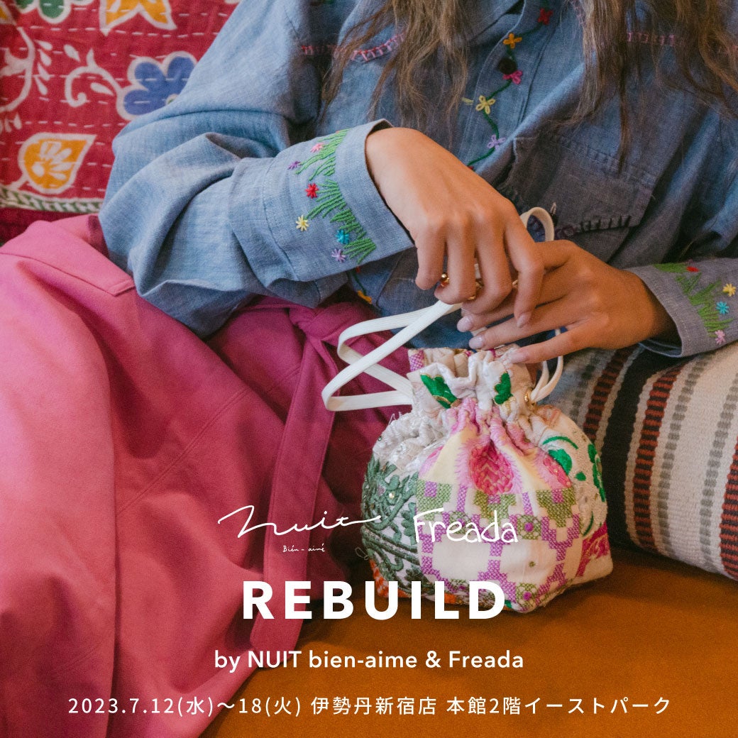 エスニックブランドFreadaが名古屋のバッグブランドNUIT bien-aime(ニュイ ビエン エメ)と伊勢丹新宿店でPOPUPを開催します。「REBUILD by NUIT bien-aime & Freada」と題し、“再構築”や“復元”をテーマに様々な古布をリメイクしたアイテムをご用意します。また、Freada23秋冬新作をどこよりも早くご覧いただけます。