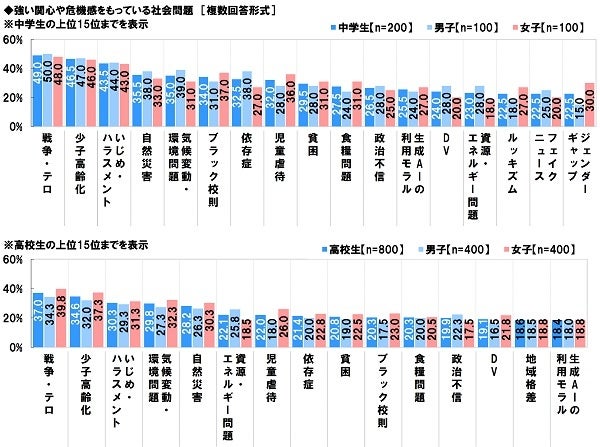 高校生についてみると、「戦争・テロ」(37.0%)が最も高くなり、次いで、「少子高齢化」(34.6%)、「いじめ・ハラスメント」(30.3%)と、上位3位までは中学生と同じ順位になりました。