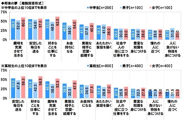 男子中高生1位「安定した毎日を送る」、女子中高生1位「好きなことを仕事にする」