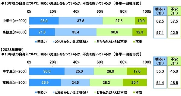 全国の中高生1,000名に、10年後の自身について、明るい見通しをもっているか、不安を抱いているか聞きました。