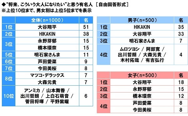 ◆中高生が“将来、こういう大人になりたい”と思う有名人 男子1位は「HIKAKINさん」、女子1位は「大谷翔平さん」