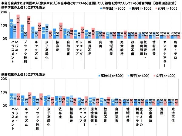◆自分自身または周囲の人が当事者となっている社会問題 中学生・高校生いずれも「いじめ・ハラスメント」が1位 女子高校生では「ルッキズム」が1位に