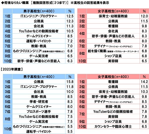 高校生についてみると、男子高校生では1位「ITエンジニア・プログラマー」(12.5%)、2位「公務員」(12.3%)、3位「会社員」(11.3%)、4位「YouTuberなどの動画投稿者」(10.5%)、5位「ゲームクリエイター」(8.5%)となりました。
