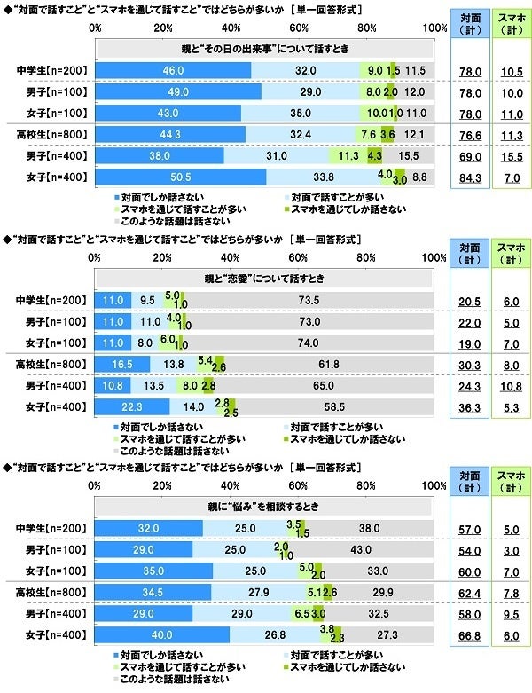 ≪親と“その日の出来事”について話すとき≫については親に今日あったことを伝える際は、中学生、高校生ともに対面で話をする人が大多数となりました。男女・学校別にみると、『対面(計)』と回答した人の割合は、女子高校生では84.3%と、他の層と比べて高くなりました。