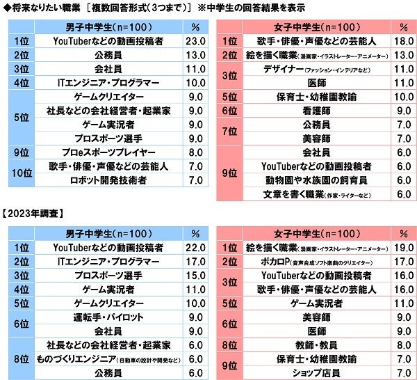 2023年の調査結果と比較すると、男子中学生では「YouTuberなどの動画投稿者」が2023年1位→2024年1位となり、2017年の調査開始以来5回連続の1位でした。