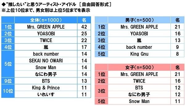 ◆中高生が“推したい”と思うアーティスト・アイドル 男子・女子ともに1位は「Mrs. GREEN APPLE」