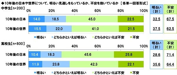◆「10年後の日本が不安」中学生では68%、高校生では71%