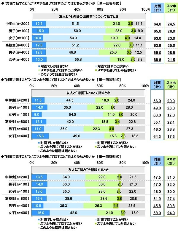 ≪友人に“悩み”を相談するとき≫については、中学生、高校生ともに対面で話す人が多いものの、スマホを通じて話す人も3割前後と少なくないことがわかりました。