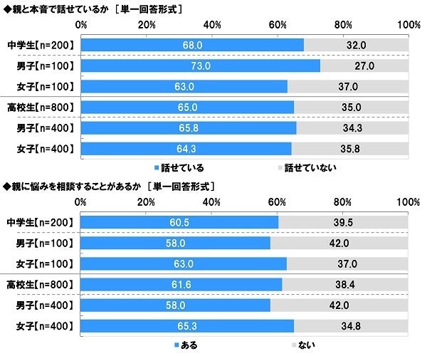 ◆「親と本音で話せている」中学生の68%、高校生の65%