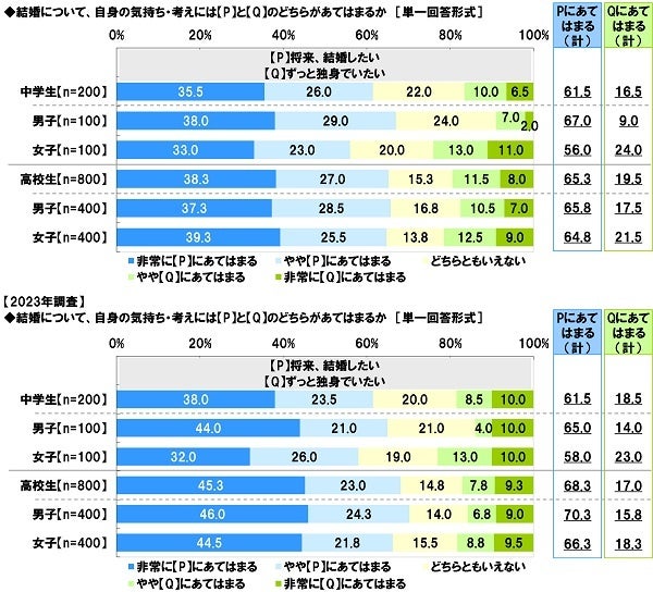 結婚について、「将来、結婚したい」と「ずっと独身でいたい」のどちらにあてはまるかでは、中学生、高校生ともに『将来、結婚したい(計)』(中学生61.5%、高校生65.3%)が多数派でした。