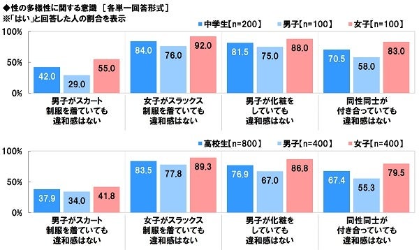 高校生についてみると、「はい」と回答した人の割合は、≪男子がスカート制服を着ていても違和感はない≫では37.9%、≪女子がスラックス制服を着ていても違和感はない≫では83.5%、≪男子が化粧をしていても違和感はない≫では76.9%、≪同性同士が付き合っていても違和感はない≫では67.4%となり、高校生でも女子のスラックス制服や男子の化粧、同性同士の交際には違和感をもたない人が多数を占めました。