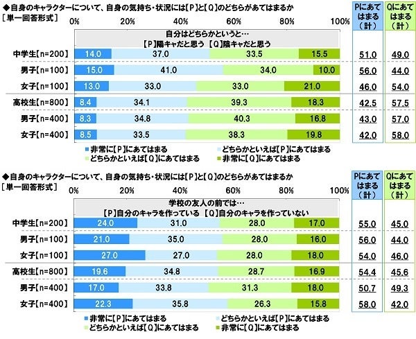 ◆「学校の友人の前では自分のキャラを作っている」中学生の55%、高校生の54%、女子高校生では58%