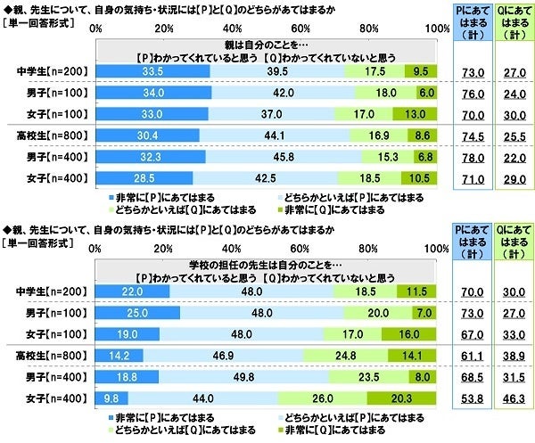 全回答者に、親、先生について2つの内容を提示し、自身の気持ち・状況がどちらにあてはまるか聞きました。