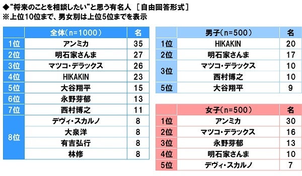 ◆中高生が“将来のことを相談したい”と思う有名人 男子1位は「HIKAKINさん」、女子1位は「アンミカさん」