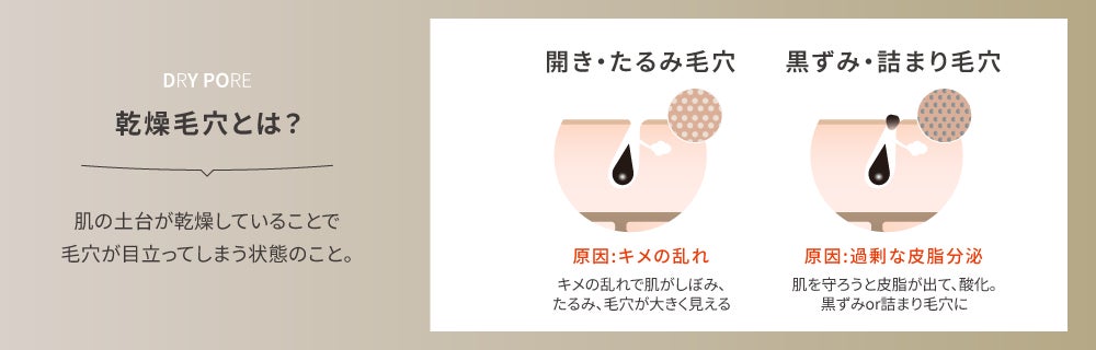 乾燥により「キメが乱れることで毛穴が大きく見える、開き毛穴・たるみ毛穴になっている」、もしくは「肌を守ろうと皮脂が過剰に出て、黒ずみ・詰まり毛穴になっている」場合、“取り除くケア”だけでは肌のうるおいまで奪ってしまいます。毛穴目立ちを解決するためには、うるおいはしっかり残しながら不要なものだけを落とすケアが日常的に必要です。