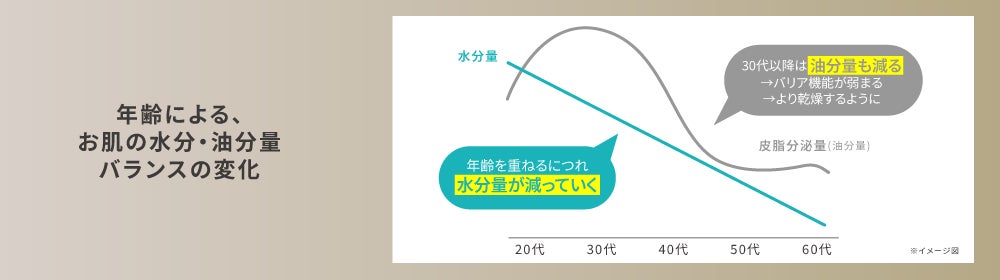 30代以降の肌における、水分・油分量バランスの大きな変化に着目。水分量減少に加え、皮脂分泌量(=油分量)も減ってくるため、バリア機能が一気に低下し、乾燥を感じやすくなります。