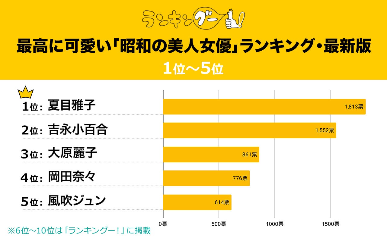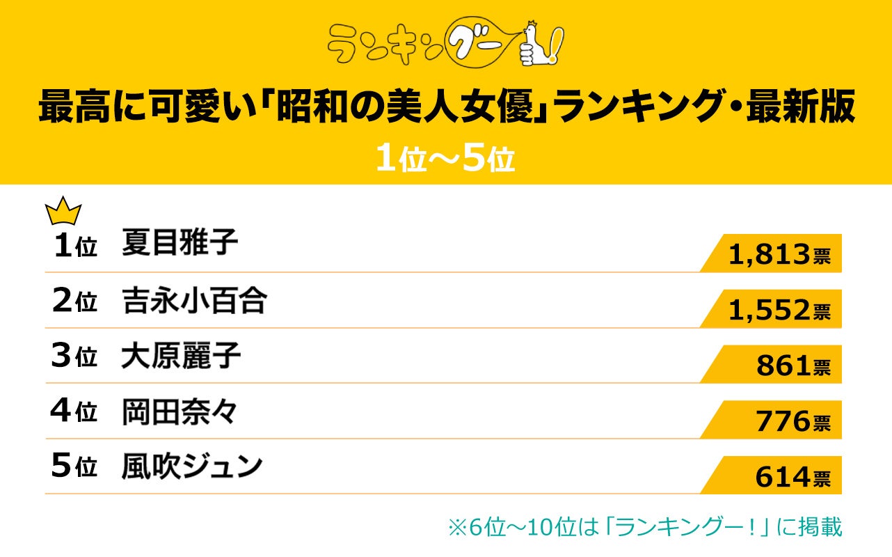 ランキングー!では昭和の美人女優をピックアップし、ランキングを調査。全年代の男女(性別回答しないを含む)10,580名にアンケートを行い、TOP10を決定しました。ここではTOP5をご紹介します。