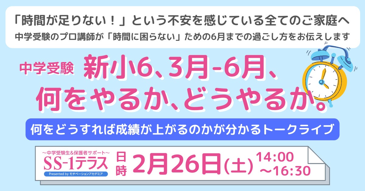 株式会社リンクアンドモチベーション(本社:東京都中央区、代表:小笹芳央、証券コード:2170)のグループ会社で、学習塾「中学受験専門個別指導教室 SS-1」(https://www.ss-1.net/)を運営する株式会社モチベーションアカデミア(本社:東京都中央区、代表:柿木秀雄)は、2022年2月26日(土)に中学受験を目指すお子さんを持つ保護者様向けトークライブ「新小6、3月-6月、何をやるか、どうやるか。」を開催いたします。