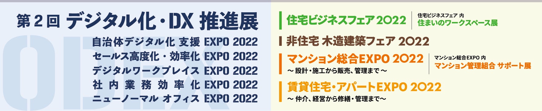 デジタル化・DX推進展 実行委員会、および、住宅ビジネスフェア/非住宅 木造建築フェア/マンション総合EXPO/賃貸住宅・アパートEXPO 実行委員会(実行委員長:株式会社イノベント 取締役代表執行役社長 堀 正人)は、2022年6月16日(木)・17日(金)の2日間、東京ビッグサイト 東7ホールにて「第2回 デジタル化・DX推進展」及び「第17回 住宅ビジネスフェア 2022」「第2回 非住宅 木造建築フェア2022」「第3回 マンション総合EXPO 2022」「第2回 賃貸住宅・アパートEXPO 2022」を開催します。