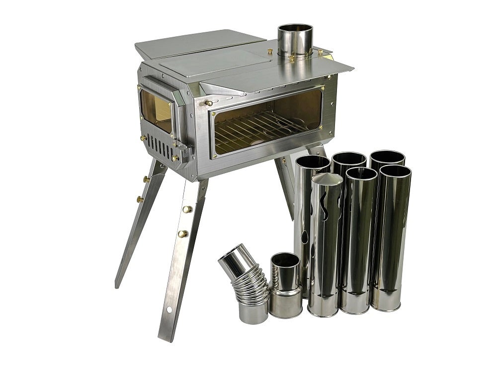 親子で楽しむキャンプをテーマに展開するキャンプギアブランド・キャンキャンパー。その第一弾として開発されたのがこの「焚き薪ストーブ(s2403)」です。最長150cmまで伸ばせる煙突に加え、煙の向きを調整できる45度エルボを標準装備しており、どんなサイトでも扱いやすい仕様になっています。炎を眺めながらゆったりとした時間を共有できるよう、前面のドアに加えて両サイドにも耐熱ガラス窓を配置し、さまざまな角度から炉内の炎を楽しめます。