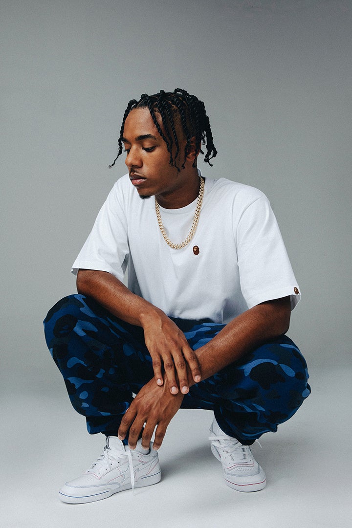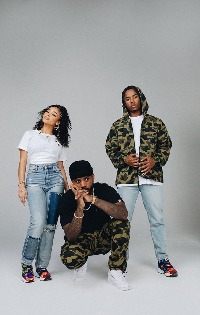 今回のBAPE®︎とReebok がチームアップしたコレクションのキャンペーンクリエイティブは、人気R&BシンガーのBryson Tiller(ブライソン・ティラー)を筆頭に、レーベルメイトでありラッパーのPardison Fontaine(パーディソン・フォンテーヌ)、シンガー兼MCのRyan Trey(ライアン・トレイ)、シンガーのNia Sultana(ニーア・サルタナ)で構成されています。ブライソンの長年のコラボレーターであるRo.Lexxが全ての撮影を担当し、BAPE®のアパレルコレクションと組み合わせたビジュアルを展開しています。