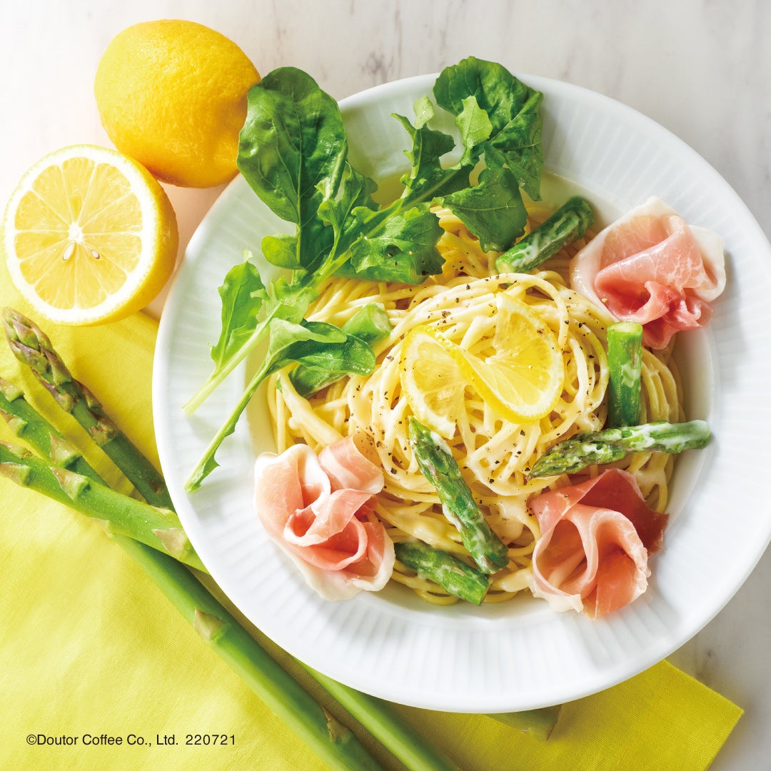 レモンのクリームソースパスタにハモンセラーノ、アスパラガス、ルッコラなどをトッピングしたクリームパスタです。
