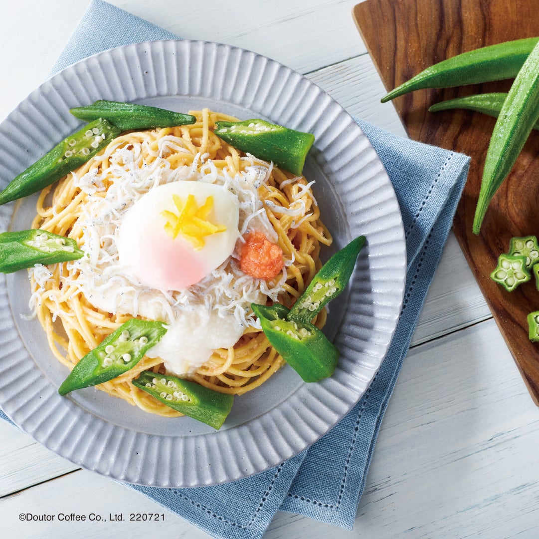 明太子パスタにとろろ、しらす、オクラや半熟卵などをトッピングした和風パスタです。