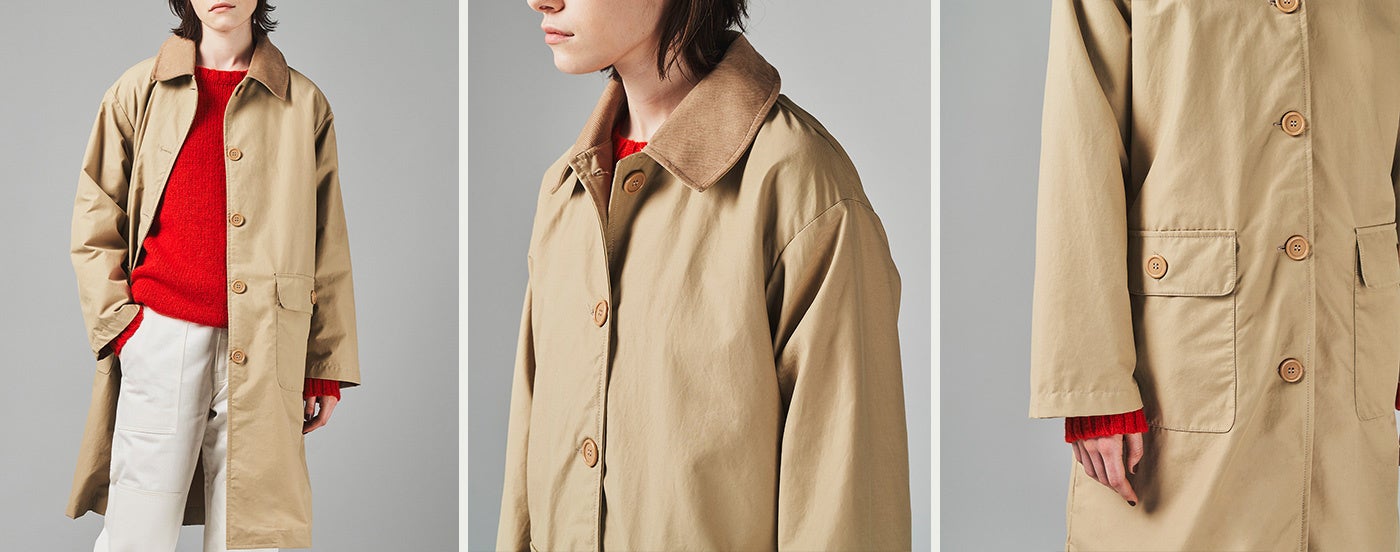 大きなコーデュロイ襟やフラップ付きのポケット等、メンズライクな雰囲気のウィメンズステンカラーコート。ゆとりのあるシルエットでざっくりと羽織れるサイズ感。アウターには撥水加工が施された高密度のツイルの生地を採用。また内側のライナーは、小さいダイヤ柄パターンのキルティングで、薄くて軽い仕上がりです。