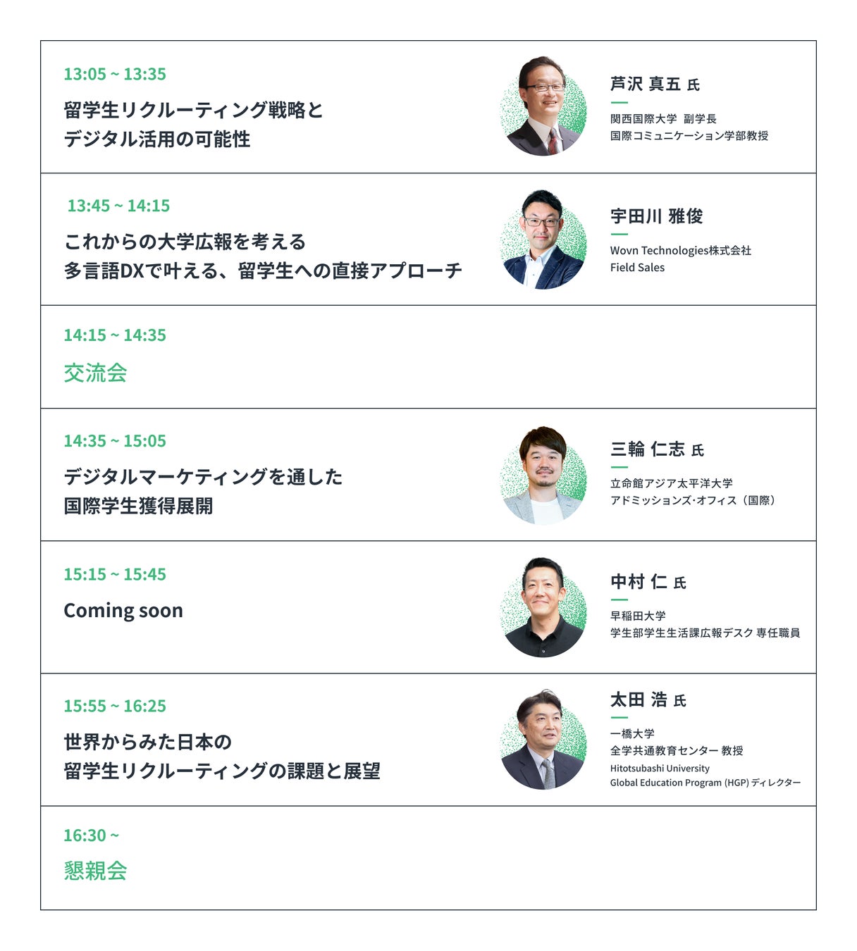 大学国際化や留学生獲得に向けた広報活動に取り組まれている有識者・実務者をお招きした全5つのセッションを予定しています。