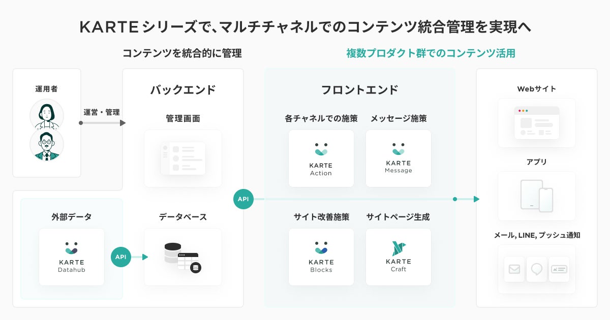 このたびの資産譲受により、当社プロダクト群においてコンテンツ管理領域の開発・拡充の早期化が可能となりました。KARTEによる各顧客接点でのコミュニケーション施策、KARTE Blocksによるサイト改善施策、Craft Sitesによるサイトページ生成といったいわば「フロントエンド」を担う領域に対して、コンテンツ情報をAPIで提供する「バックエンド」の機能がKARTEシリーズに備わり、コンテンツを統合的に管理できるようになります。