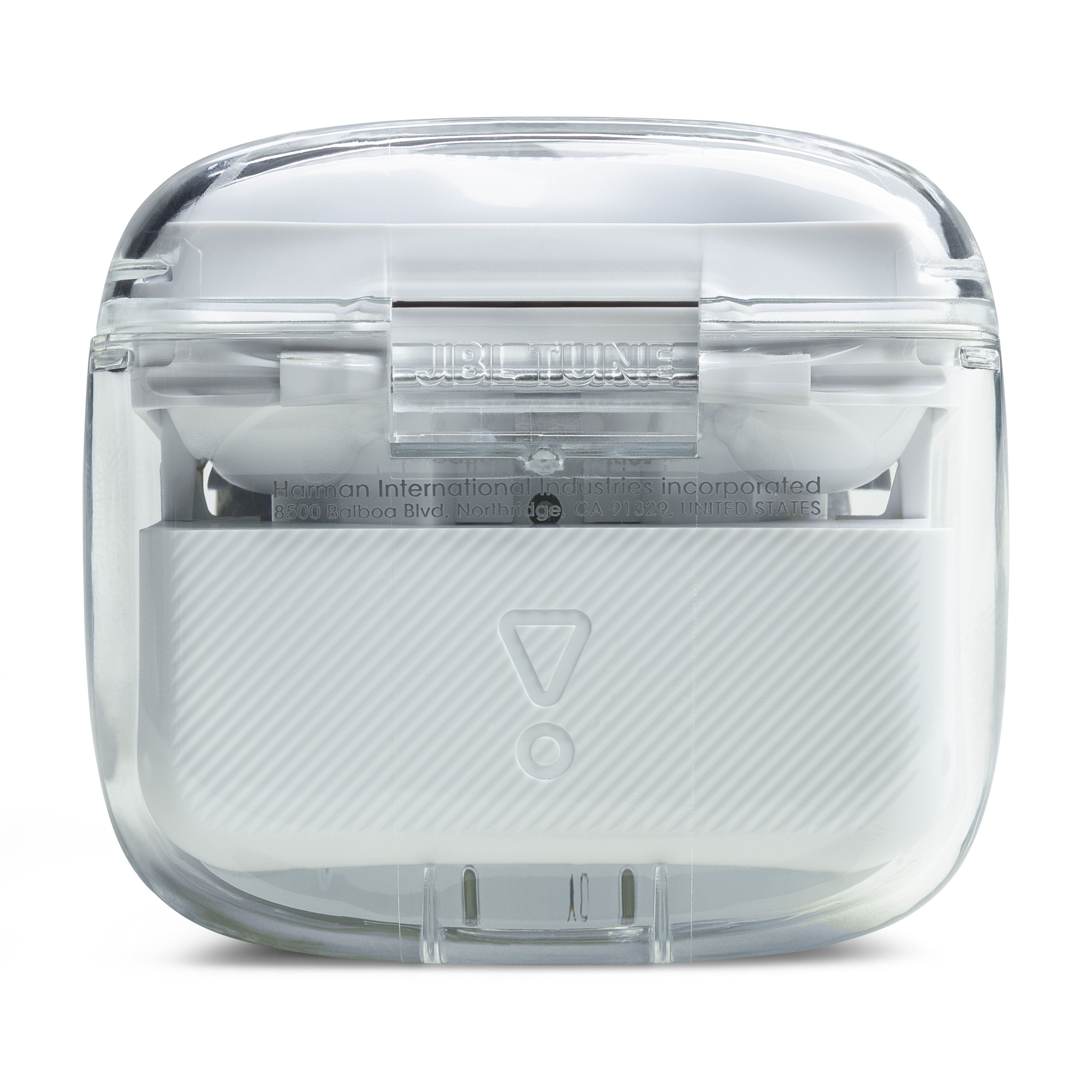 90年代に巻き起こったスケルトンブーム。その再熱トレンドの先駆けとなるスケルトンデザインを採用。ケースなど透明部分の素材には、航空機の窓などにも使われているハイグレードポリカーボネートを使用しており、耐紫外線性が施されているため黄ばみや劣化の心配が極めて低く、高い衝撃強度と耐熱性も兼ね備えています。機能面だけでなく光学的透明度も非常に高いため、水のように透き通ったケースの奥に見える緻密な内部構造は、メカニカルで近未来的なデザインに仕上がっています。ケースの背面とフタ部分にはブランドアイデンティティを表すJBLホーンのマークも施しています。