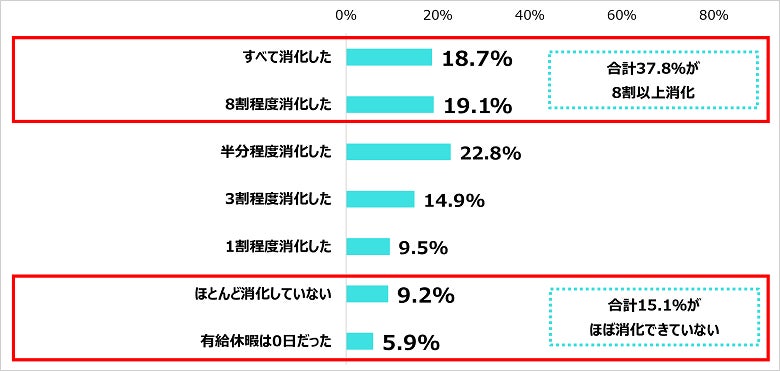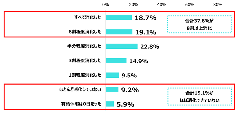 3.管理栄養士・栄養士の約4割が有給休暇を8割以上消化。一方でほとんど、あるいはまったく消化しなかった層は15.1%。職場環境に大きな差あり