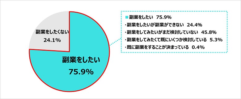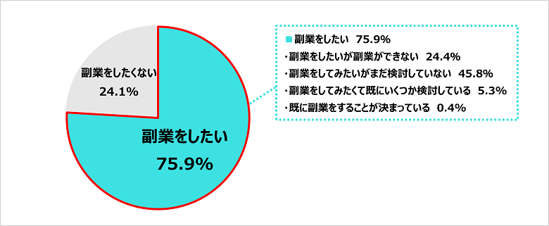 副業をしてみたいという希望は約7.5割と多いものの、実際に行っている人は少なく、副業を行うにはハードルが高い様子が垣間見える。