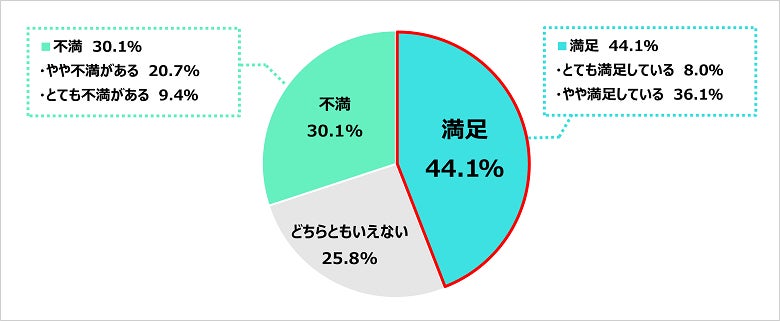 勤務先に満足している人の割合は半数以下にとどまり、やや低い様子が伺える。