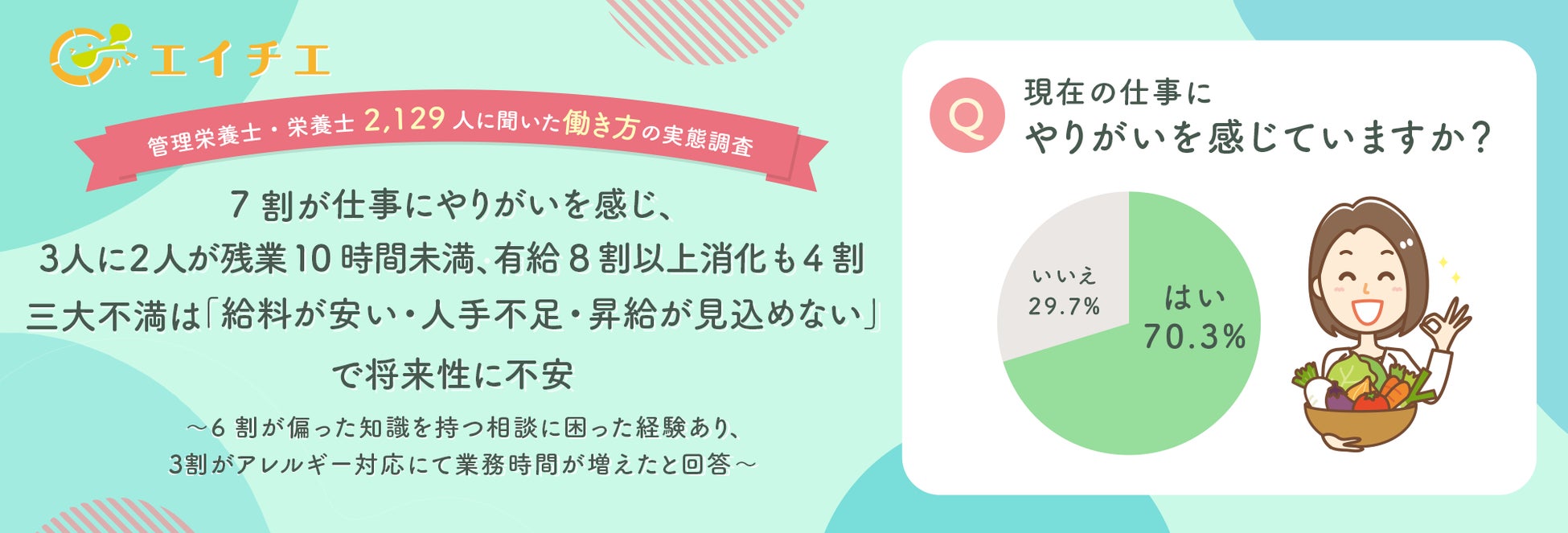 【管理栄養士・栄養士2,129人に聞いた働き方の実態調査】7割が仕事にやりがいを感じ、3人に2人が残業10時間未満、有給8割以上消化も4割