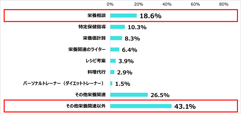 10.管理栄養士・栄養士の副業は「栄養相談(18.6%)」が最多ではあるもののバラつきあり。一般的なアルバイトも多い