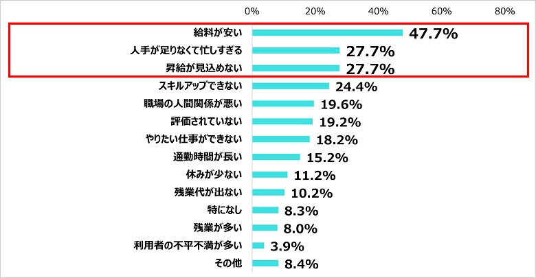 7.満足していないことは「給料が安い(47.7%)」、「人手が足りなくて忙しすぎる(27.7%)」、「昇給が見込めない(27.7%)」が上位