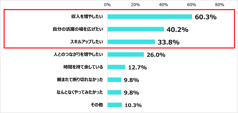 9.副業を行う理由の最多は「収入を増やしたい(60.3%)」、次点で「自分の活躍の場を広げたい(40.2%)」、「スキルアップしたい(33.8%)」