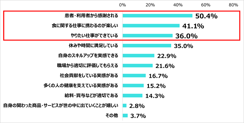 2.やりがいを感じていることの1位は「患者・利用者から感謝される(50.4%)」、次いで「食に関する仕事に携わるのが楽しい(41.1%)」、「やりたい仕事ができている(36.0%)」が上位