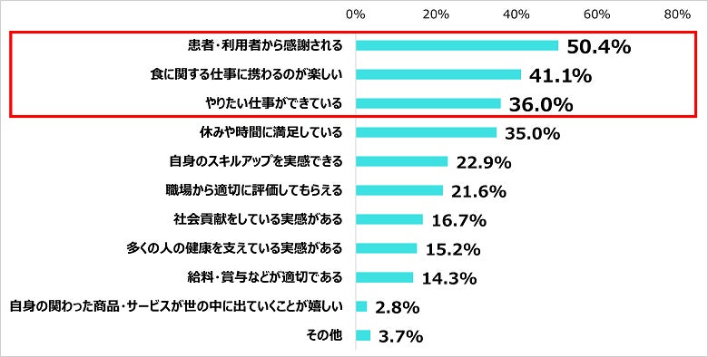 調査の結果、管理栄養士・栄養士の約7割が仕事にやりがいを感じているということがわかりました。やりがいを感じていることの内容は、「患者・利用者から感謝される」、「食に関する仕事に携わるのが楽しい」、「やりたい仕事ができている」が上位であり、社会の役に立つ実感や、目指していた自分の姿に重ね合わせつつ充実感を得られている様子が伺えます。