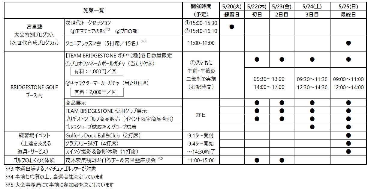 会場内では、当社グループの様々な取り組みを実際に見ていただける展示や体験イベントをはじめ、「心動かす『ゴルフのわくわく』を提供しつづける」という大会コンセプトの体現のため、ゴルフファンの皆様、これからゴルフを始める皆様との特別な接点の場としてさまざまなファンイベントを実施します。