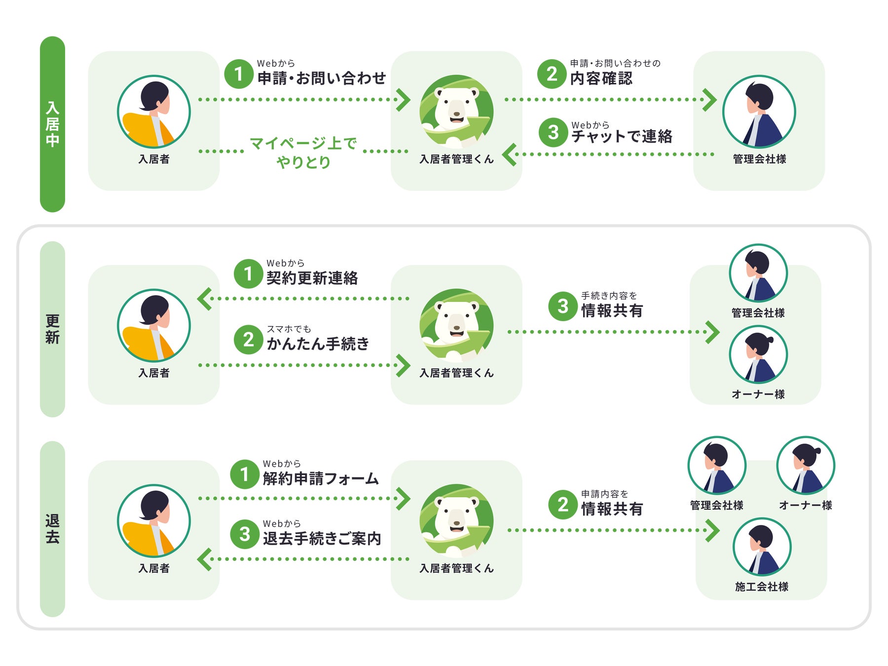 「入居者管理くん」は、マイページ機能と、チャット等によるコミュニケーションで、入居者とのスムーズなやりとりを可能にする、賃貸住宅の入居中業務管理システムです。