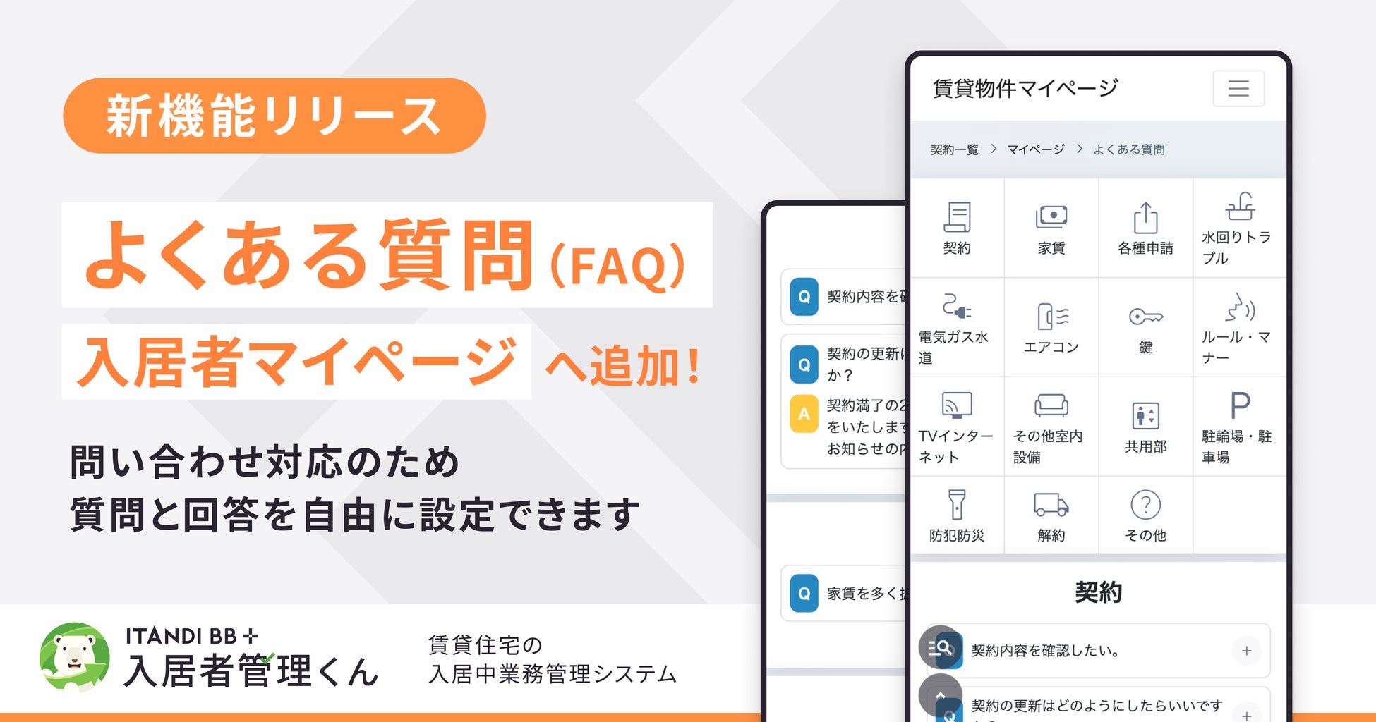 テクノロジーで不動産取引をなめらかにするイタンジ株式会社(以下「当社」)は、当社が提供する賃貸住宅の入居中業務管理システム「入居者管理くん」のマイページに、「よくある質問(FAQ)機能」を追加しました。これにより賃貸不動産管理会社(以下「管理会社」)は、入居者からの問い合わせの多い質問とその回答を設定することができるようになり、入居者による自己解決を促進。業務効率化や入居者の利便性向上が期待されます。