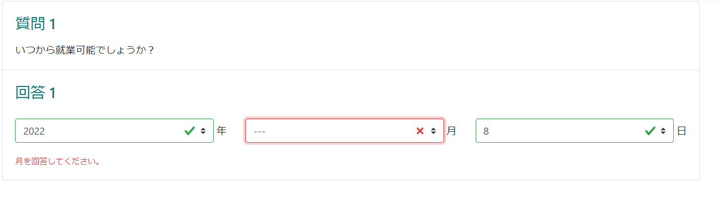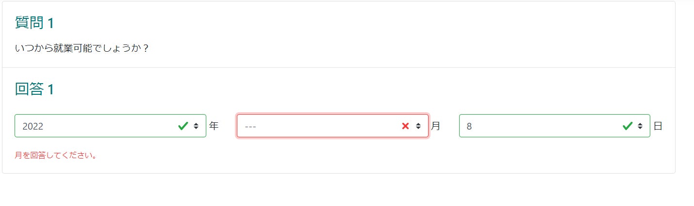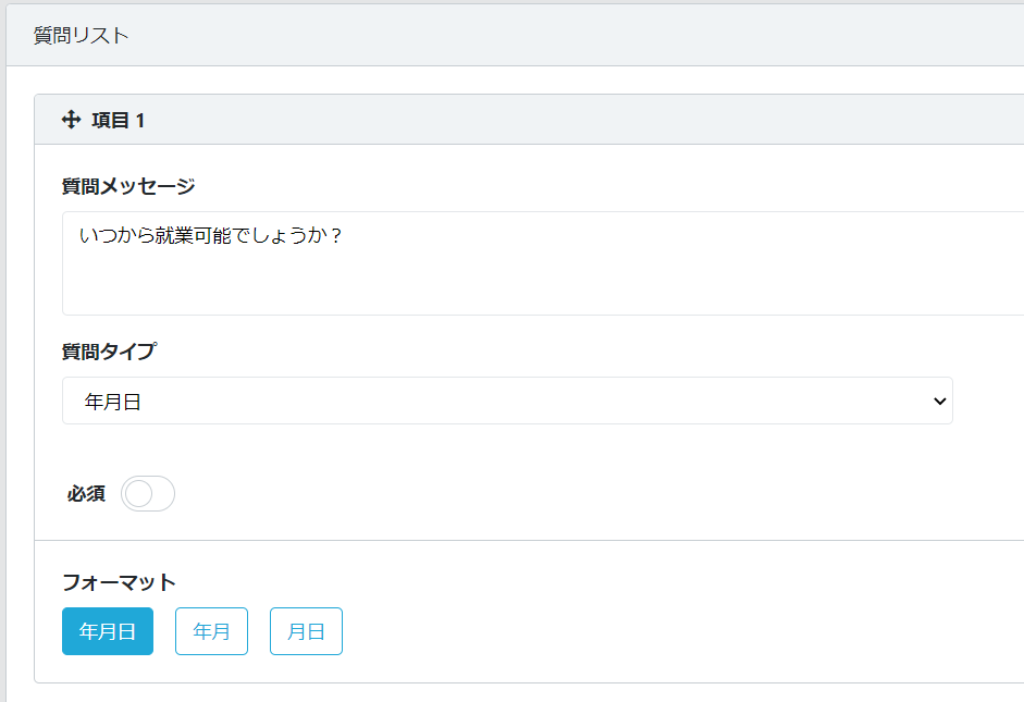 ITSUMENでは質問テンプレートの設問を自由に設定出来、回答方法もテキスト、ラジオボタン、チェックボックス、動画などを設定出来るようになっております。その回答方法に「年月日」「年月」「月日」を今回追加いたしました。いつから就業可能か、退職日はいつか、といった質問を設定する際にこれまではフリーテキストでの回答になっていました。その為、書式が統一されておらず読みづらい、応募者にとっても入力文字数が多くて手間になっているというお声を頂くことがございましたので追加実装いたしました。株式会社マルジュではこのような細かな使い勝手も日々改善しブラッシュアップしてまいります。